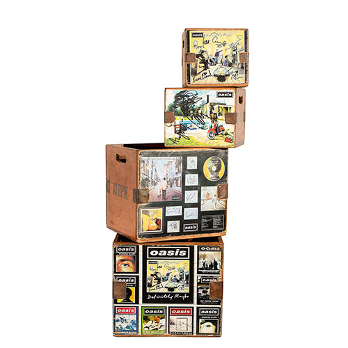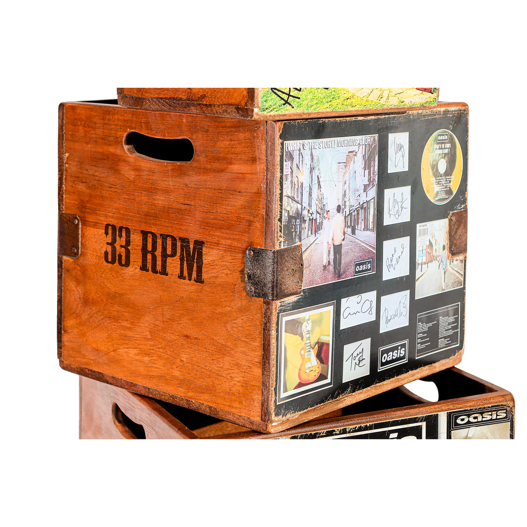 - Design The crates feature artwork inspired by iconic Oasis album covers and imagery, along with "45 RPM" and "33 RPM" text to indicate common record sizes.