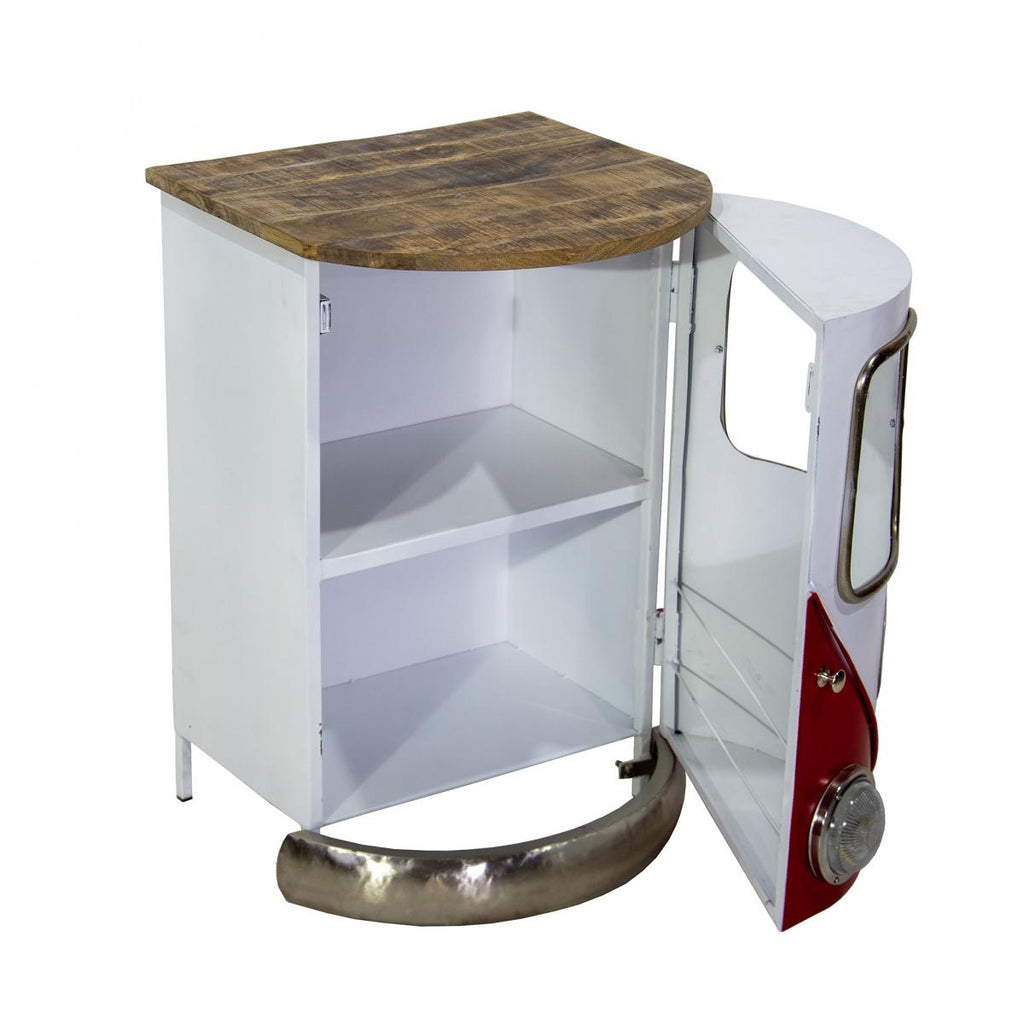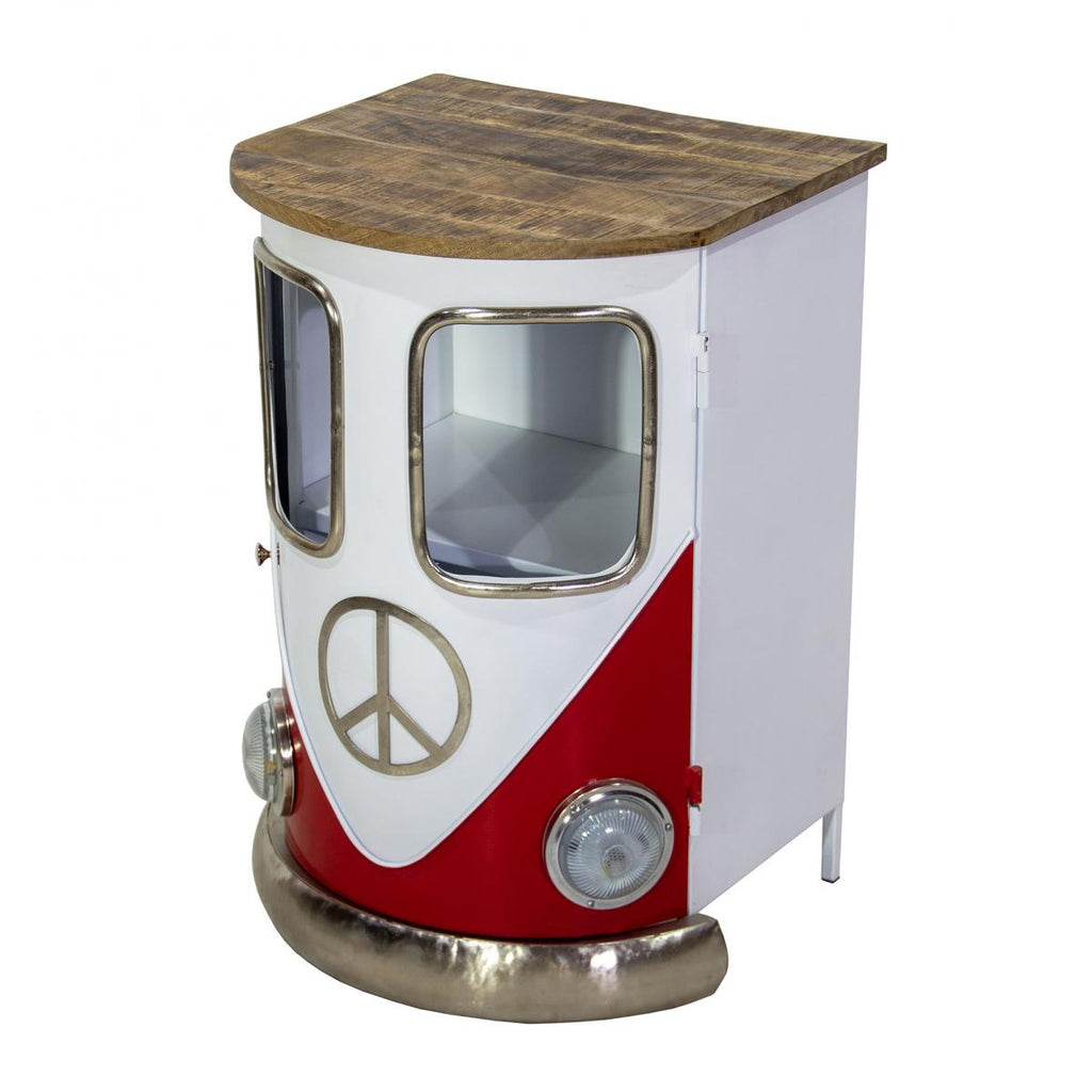 Bring a burst of color and nostalgia into any room with our Retro Camper Van Red Side Table, designed to look just like a classic vintage bus — complete with chrome-style trim, window panels, headlights, and a peace-symbol emblem.